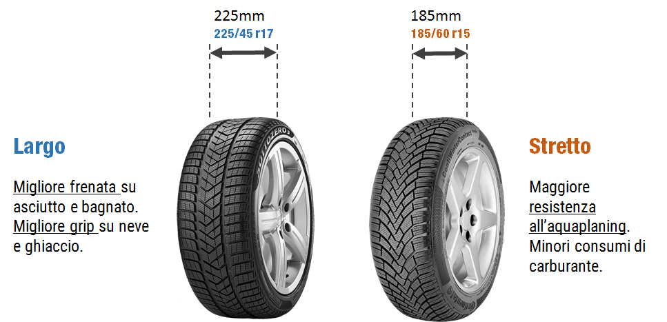 Sabato 10 Novembre 2018Non sono d' accordo. Ho un audi A3 quattro con gomme 205/55 r16 invernali e una A4 quattro con gomme invernali 225/50 r17, montando gomme di qualità(Bridgestone,Michelin) su entrambe vi posso garantire che la differenza in accelerazione, frenata e curva è notevole: la A3 con gomme più strette va molto meglio. Il motivo e molto semplice la pressione che viene esecitata sulla neve da una gomma stretta è maggiore di quella di una gomma larga a parità peso.
