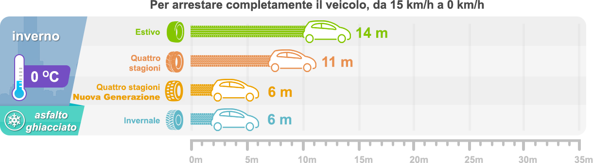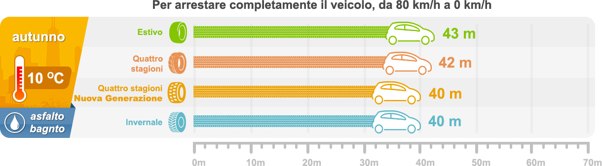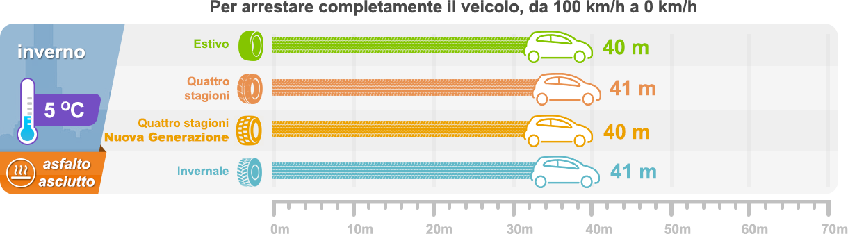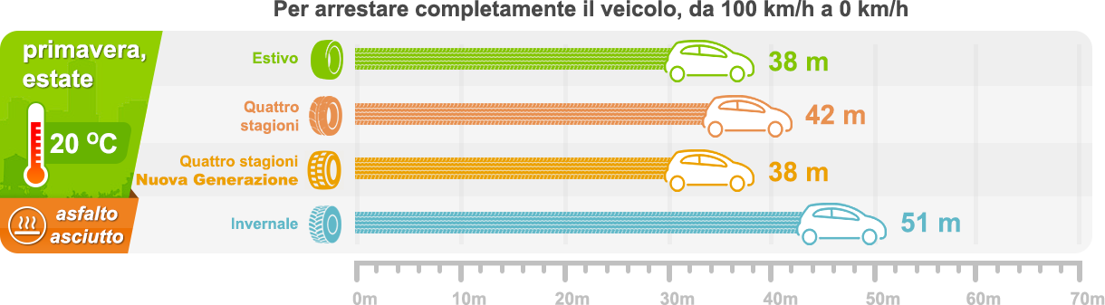 Tutte le infografiche contenute in questo articolo presentano i valori medi calcolati opportunamente sulla base dei test condotti da TireRack.com, TCS, il Canada, ed altri, Abbiamo aggregato e confrontato i risultati dei diversi test per mostrare una panoramica più completa e precisa possibile. Essendo valori medi, dedotti dai risultati dei test, non sono da considerarsi i valori precisi di frenata che la vostra auto otterrà con una determinata tipologia di pneumatico (estivo, invernale o quattro stagioni) perché ogni modello di pneumatico differisce da qualsiasi altro modello, e lo stesso modello di pneumatici installato su auto diverse produrrà risultati diversi. Il risultato interessante di questa analisi è l'ordine di grandezza, per capire come (e di quanto) possono cambiare le prestazioni della vostra auto in funzione della tipologia di pneumatico.