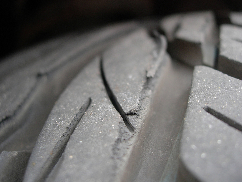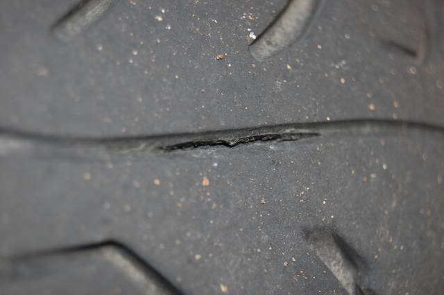 - screpolature nella gomma; controllate sia le zone laterali che il battistrada alla ricerca di piccole crepe che appaiono in punti di flessione sul fianco o tra i blocchi del battistrada, anche questo è un indice del processo di vulcanizzazione che indurisce la gomma, maggiori sono le screpolature maggiormente avanzato è il processo di vulcanizzazione.