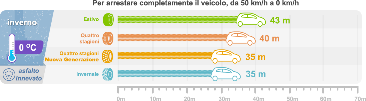 I pneumatici invernali garantiscono aderenza e ottime prestazioni, sia su fondi scivolosi, con neve o ghiaccio, sia sull'asfalto asciutto. Su tutti i tipi di strada, sotto i 7° gradi, quelle invernali vanno persino meglio delle estive. Questo grazie alla loro mescola morbida, più resistente al freddo. Uno dei test effettuati verifica come si comportano su un terreno innevato. Ad esempio nel caso di due berline dello stesso modello su cui sono state montati rispettivamente due diversi treni di gomme, su una invernali e sull'altra estive. A 48km/h, l'auto con gomme invernali impiega 27 metri per fermarsi. Quella con gomme estive, 85 metri. Ben 58 in più di quella che monta gomme invernali. Su un test di accelerazione, la differenza risulta ancora maggiore: le gomme estive pattinano sul manto ghiacciato e faticano a partire. I tasselli ricchi di lamelle delle gomme invernali esercitano un effetto ventosa, raccogliendo la neve. In curva, infatti, queste si comportano come fossero su un terreno asciutto, mentre quelle estive faticano a mantenere aderenza.
