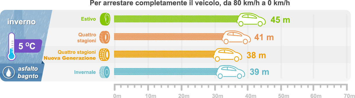 Se la sicurezza è l'elemento più importante, le gomme invernali sono la scelta giusta fin d'ora. Del resto, i pneumatici sono l'unico elemento che collega l'auto alla strada. Anche su terreni bagnati, le differenze sono evidenti. Con temperatura dell'asfalto di poco superiore ai 4°c e temperatura dell'aria di 6°C, un'auto con gomme invernali impiega 35,5 metri a fermarsi. Senz'altro un ottimo risultato! Mentre con gomme estive 42,5 metri, più di un'auto di differenza.